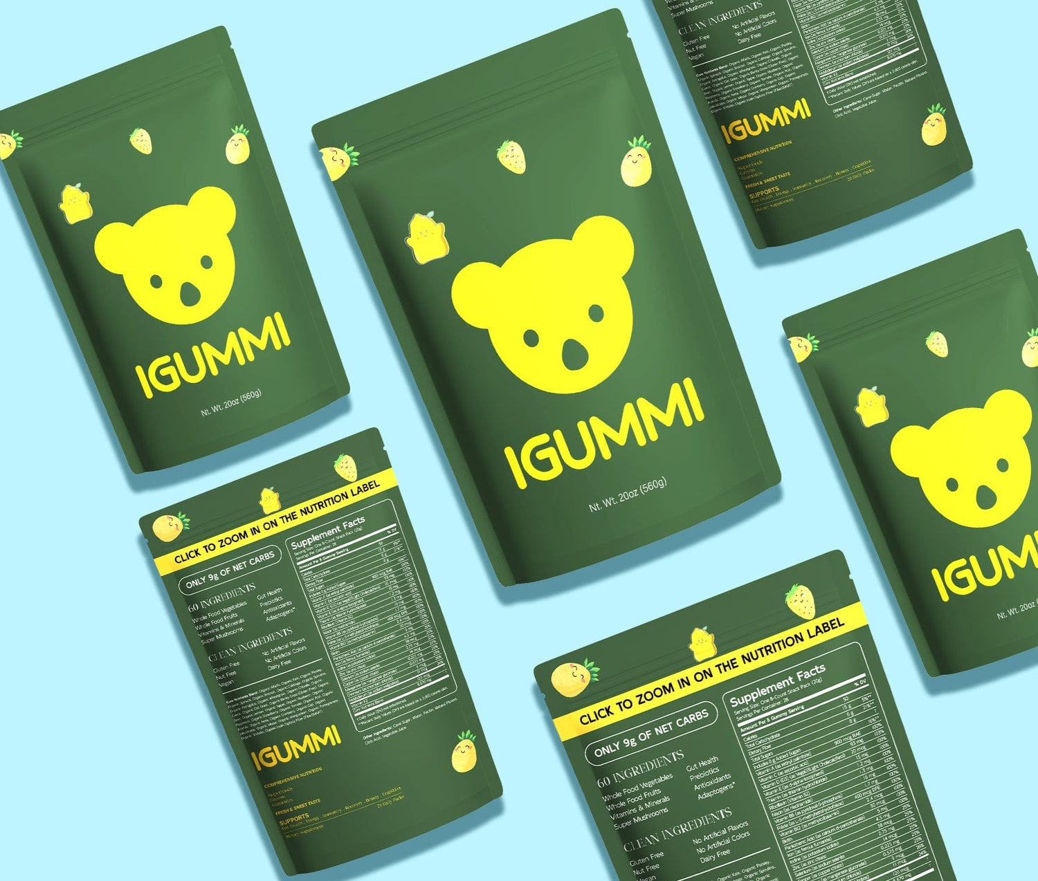 So we decided it was time to fix it. No more choking on and popping pills like a pharmacy. No more clean-up and disgust from gross powders. And no more cobbling together handfuls to dozens of supplements. Igummi is comprehensive nutrition, made convenient and delicious.